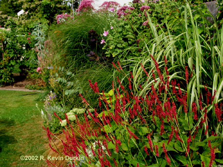 A mixed border, including eupatorium maculatum "Gateway," persicaria amplexicaulis "Firetail," and miscanthus sinensis "Cabaret."