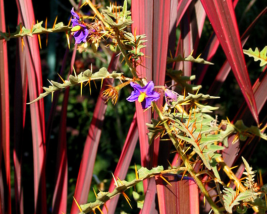 This spiky plant, solanum 'Pyracantha,' is one of my all times favorites. Here it grows amongst phormiun 'Guardsman.'