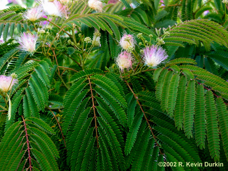 Albizia julibrissin "Rosea" has pink fluffy flower clusters from mid-summer on.